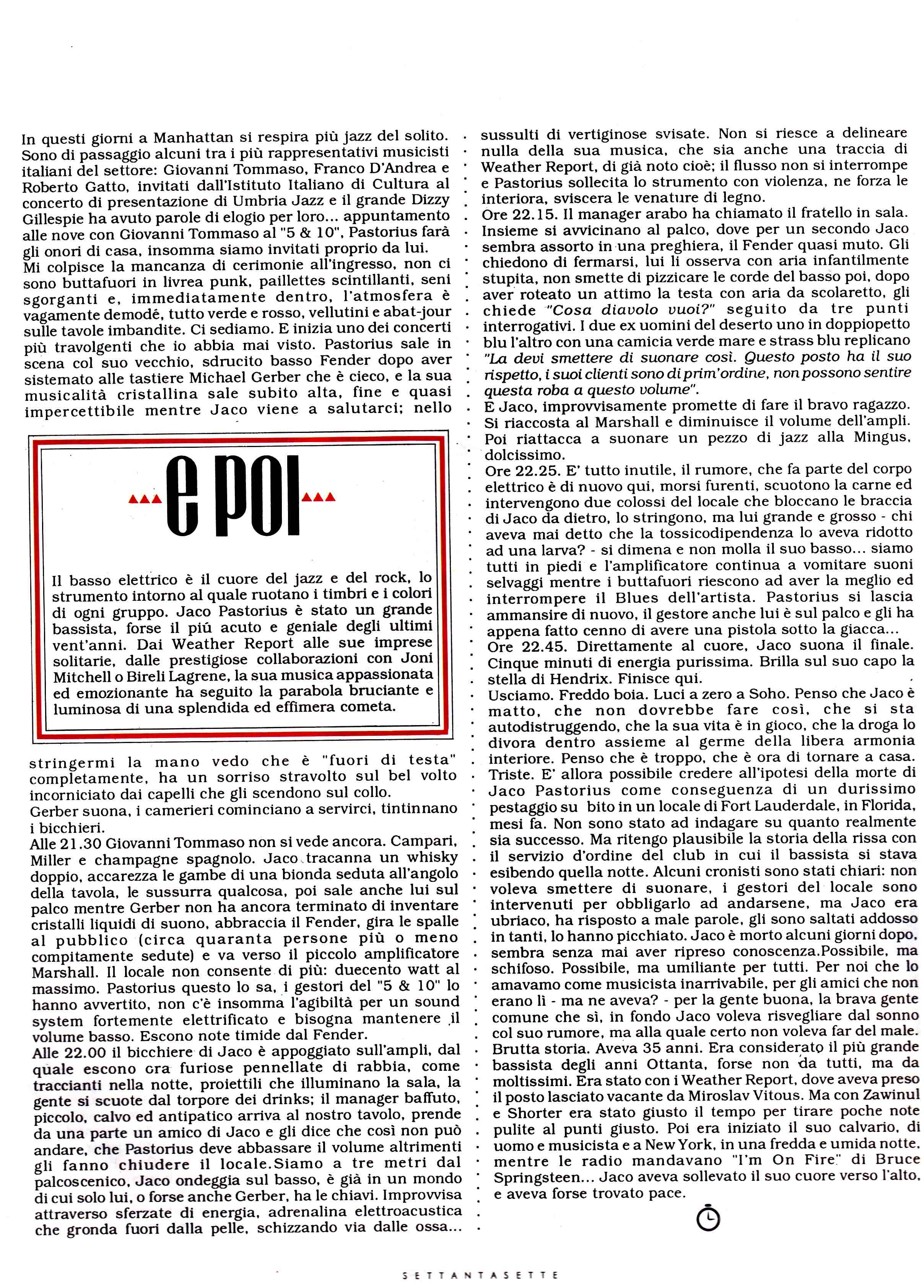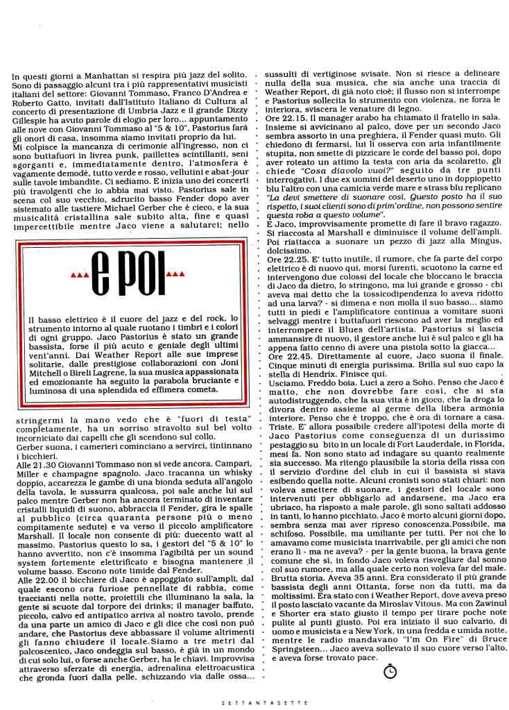Sono sempre stato affezionato all’articolo che a breve leggerete. Lo scrissi nel 1984, dedicandolo a Jaco Pastorius. Fu pubblicato cinque anni dopo, sul secondo numero del 1989 di “Storie”, una splendida meteora editoriale diretta da Gianluca Bassi.