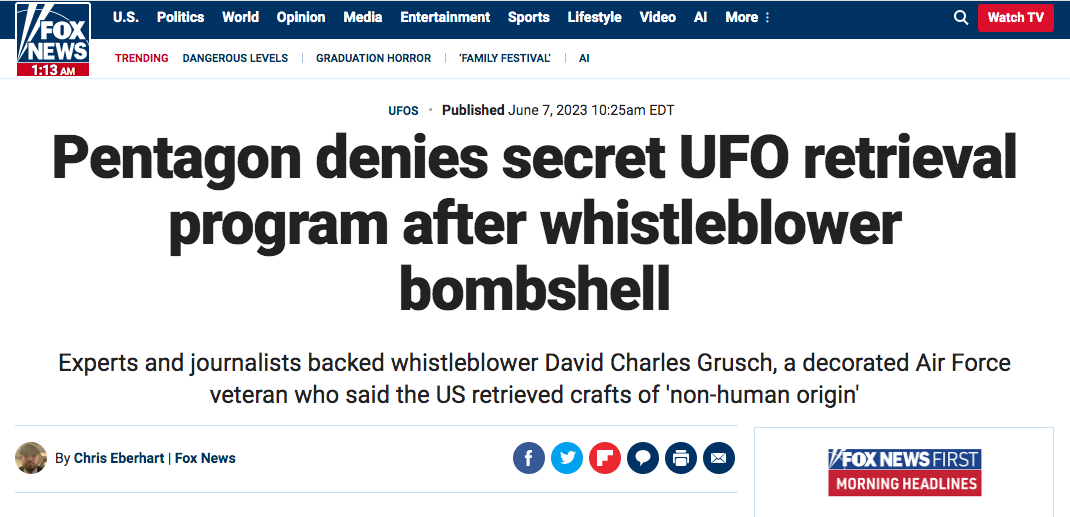 Tale però da aver suscitato una reazione ufficiale di Washington che, stando a Fox News, ha replicato il 7 Giugno: IN RISPOSTA ALLE CLAMOROSE RIVELAZIONI, IL PENTAGONO DICHIARA: “NON ABBIAMO UN PROGRAMMA SEGRETO SUI RECUPERI UFO”.