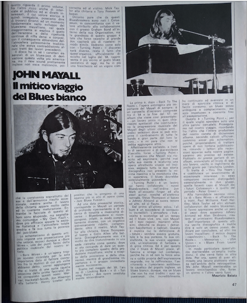 Ad una data pressoché storica, corrisponde in Mayall un periodo di profondo ripensamento e di ricerca di tonalità e musicalità diverse; i Bluesbreakers si ricompongono infatti in modo completamente diverso, con un organico ridotto comprendente Mick Taylor alla chitarra, Steve Thompson al basso e Colin Allen alla batteria. Discograficamente non c’è molto da dire, (dato il carattere di sintesi di questo articolo), mentre di grandissima importanza è l’organico successivo. Siamo nel Maggio del ‘69, l’anno di “Looking Back” e di “Turning Point”, due opere straordinarie. La prima è, dopo “Back To The Roots”, l’antologia più importante del Mayall di sempre: è un carosello di incisioni comprese tra il ‘64 e la fine del ‘67; un album che viene così presentato: “… un lavoro unico in quei chiarissimi spettacoli che costituiscono la progressione musicale del Mayall degli ultimi cinque anni… undici sezioni dove si può scoprire il cambiamento di tutte le band e gran parte del loro lavoro…” e non c’è da aggiungere altro.