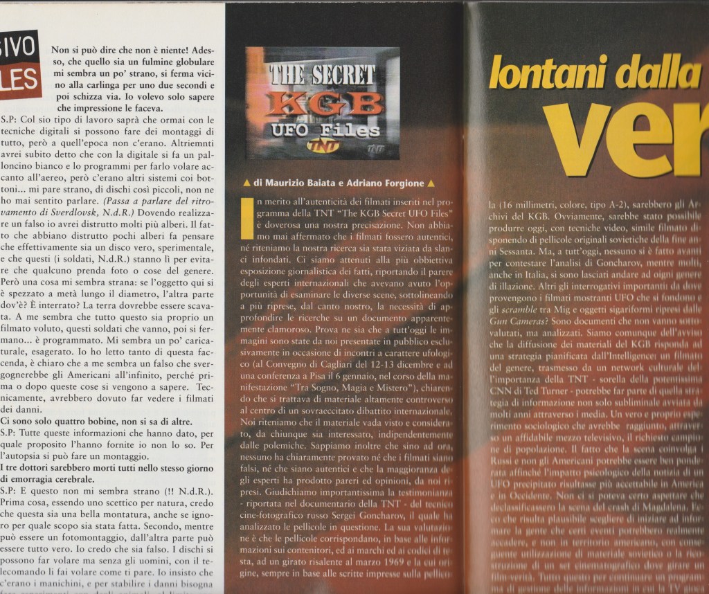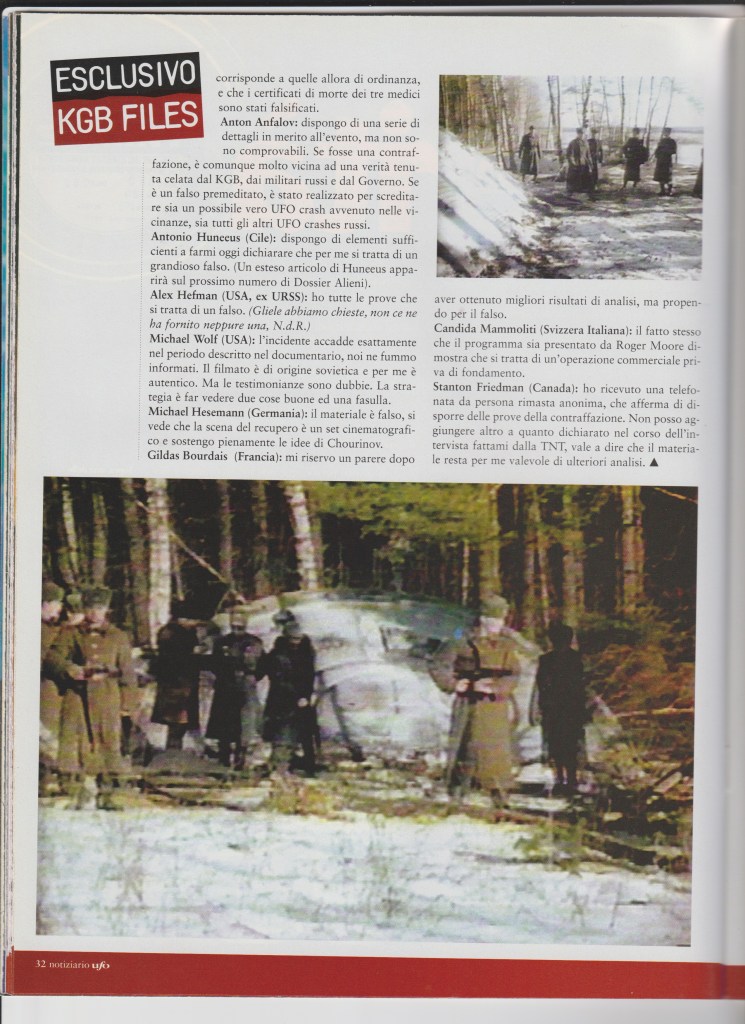 In merito all’autenticità dei filmati inseriti nel programma della TNT “The KGB Secret UFO Files” non possiamo affermare che i filmati sono autentici, né che la nostra ricerca sia stata infondata. Ci siamo attenuti alla più obiettiva esposizione giornalistica dei fatti, riportando il parere degli esperti internazionali che avevano avuto l’opportunità di esaminare le diverse scene, sottolineando la necessità di approfondire lo studio di un materiale tanto clamoroso.