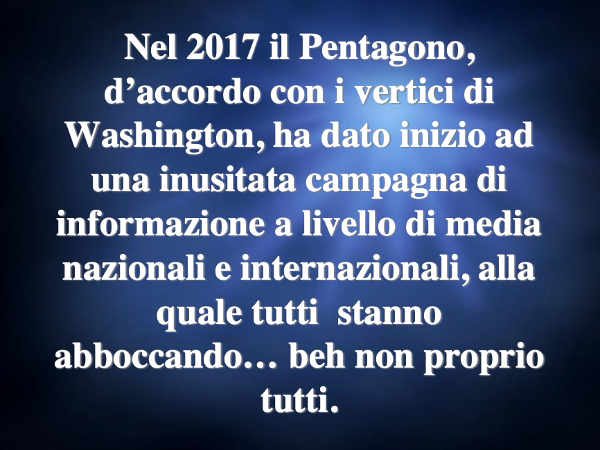 Appare assurdo che a decidere le sorti di una nazione, di un intero continente, persino del genere umano, siano apparati occulti che si servono dei militari per portare a compimento i loro progetti di dominio globale. Accade da sempre. Nell’estate del 1947 i plenipotenziari che si assoggettarono al Piano del Generale statunitense George Marshall al fine di risollevare le condizioni dei loro Paesi dissanguati e affamati dalla guerra, accettarono la spartizione dell’Europa (andrebbe detto del vecchio continente), consentendone il disfacimento e la sottomissione delle popolazioni, consegnati poi nelle mani dei vincitori. La storia del Dopoguerra d’Italia lo dice chiaramente. E oggi? I due territori, focolai e nuclei degli attuali conflitti, uno mediorientale, uno europeo, saranno anch’essi spartiti, con il placet dei militari e delle strutture che dalla loro opera di distruzione guadagnano e delle logge e apparati segreti con i quali tutto ciò era stato pianificato. La questione UFO rientra da sempre e perfettamente in quest’ottica. Vediamo come tutto abbia avuto inizio e sia stato orchestrato. Primi anni ’40: constatazione dell’esistenza del fenomeno e di interazioni aliene nei cui confronti nessuno si può opporre, neppure le onnipotenti religioni monoteiste. Seconda metà degli anni ’40: si constata l’apparente supremazia statunitense rispetto ai sovietici nel controllo della questione UFO/Alieni. Anni ’60: viene attuata la copertura totale della questione UFO/ET, da parte di entrambe le superpotenze, usando in primis lo specchietto per le allodole della corsa allo Spazio, che sì consente alla gente di guardare ai cieli, ma certamente non in attesa dell’arrivo dei dischi volanti da Marte.