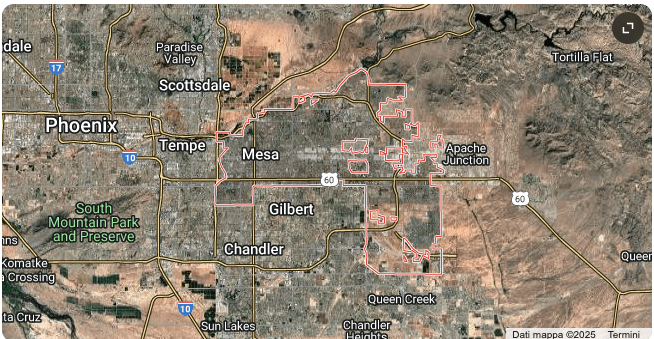 Mappa della zona di Mesa, fra Tempe e Gilbert, nella Grande Valle di Phoenix