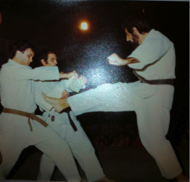 Sensei Paolo Ciotoli in tameshiwari (rottura di una tavoletta) con il maegeri (calcio frontale) che lo ha reso celebre nel Karate agonistico mondiale (foto: P. Ciotoli).