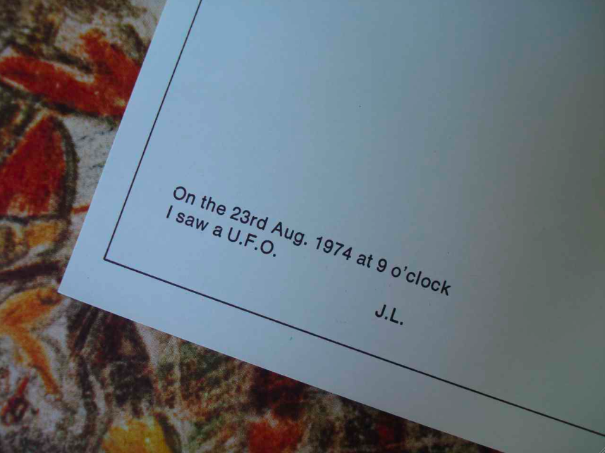 Al suo avvistamento, Lennon fa esplicito riferimento sulla copertina interna dell’album “Walls And Bridges”, uscito nel 1974, dove leggiamo: “On the 23rd August 1974 at 9 o’clock I saw a U.F.O. – JL (“Il 23 Agosto 1974 alle 21 ho visto un UFO – JL).Una dichiarazione inequivocabile. Reiterata fra le lettere della canzone “Nobody Told Me” (disco singolo uscito postumo nel 1984) in cui dice: “There’s a UFO over New York and I ain’t too surprised.” (C’è un UFO su New York e la cosa non mi sorprende molto”).
