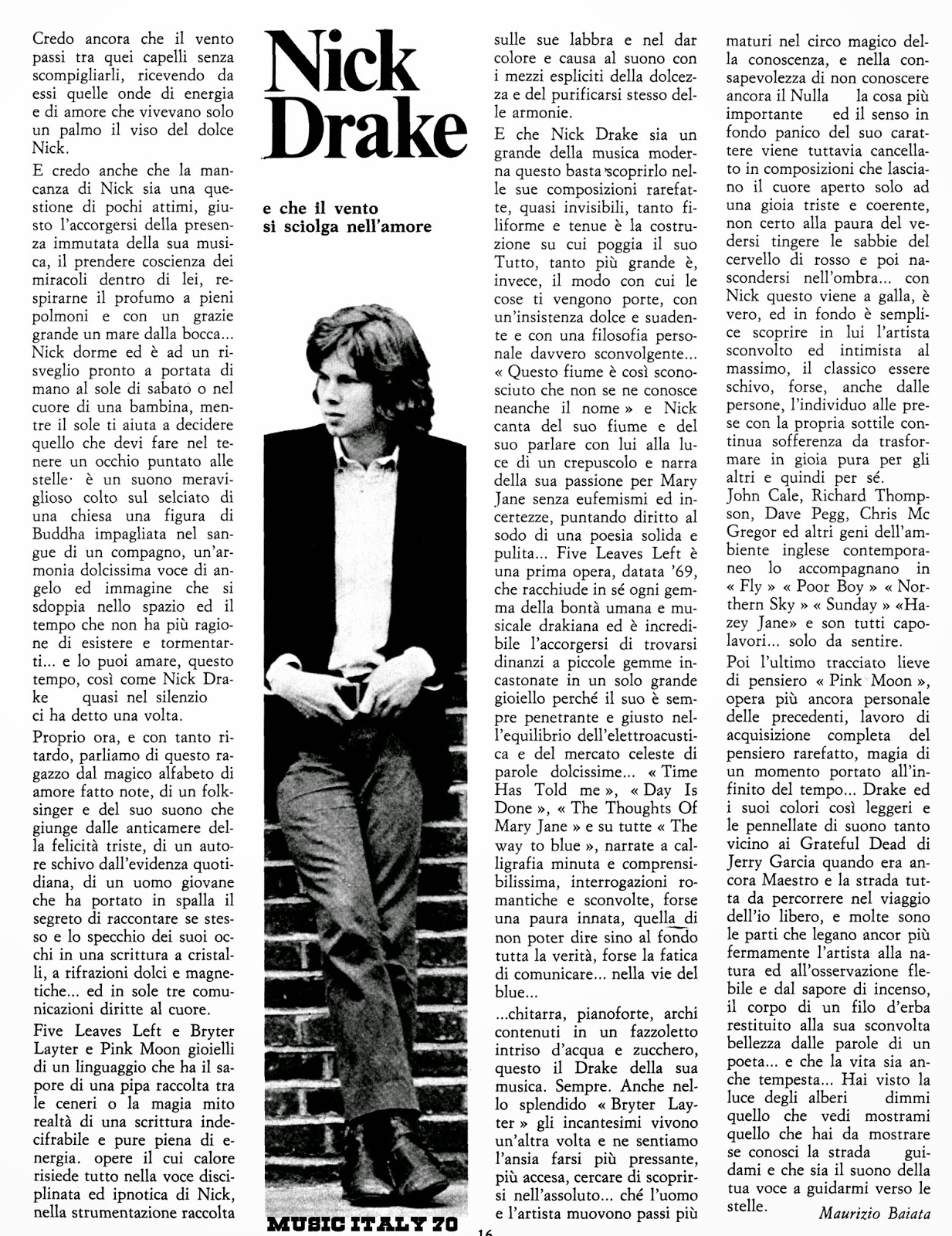 E’ molto probabile che il tuo articolo sia stato il primo apparso su un organo di stampa “ufficiale” nella realtà dei fatti però il primo avvistamento “dell’alieno” Nick Drake sul suolo italiano l’ho certificato io con un articolo apparso sulla rock fanzine Rainbow nell’ottobre del 1973 ( ved. allegato).